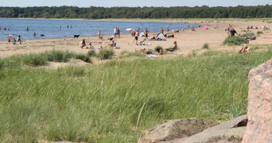 Västra stranden, Hästskoformad strand vid ett hamnområde för simning, vindsurfning och hundpromenader.